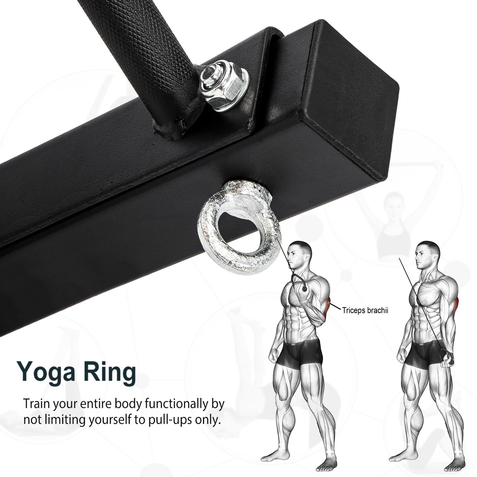 - Additional training accessories can be attached: punching bags, straps, power ropes or yoga straps (not included), to offer endless possibilities for your exercises.