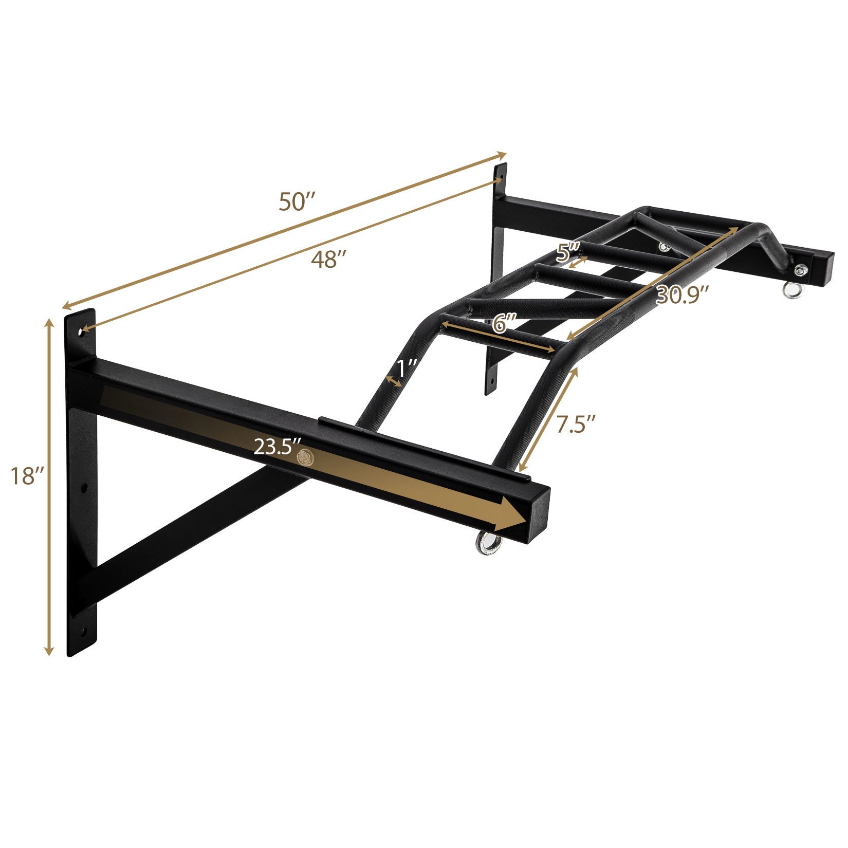 - The 1.5" x 1.5" thick steel frame with additional crossbars on both sides ensures particular sturdiness, so you can fully rely on this pull-up station during your workout.