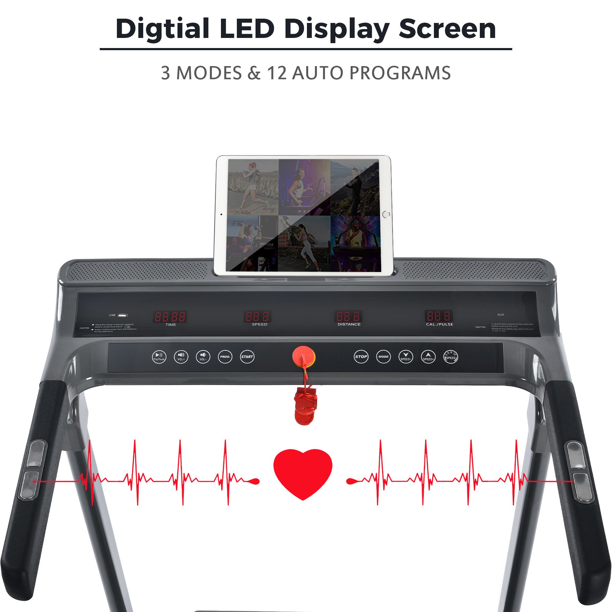 A VARIETY OF WORKOUT OPTIONS--To burn calories more effectively, we specially programmed 12 different running setting, with the help of these preset training plans and heart rate sensor, you can choose the best plan and track your heart rate changes. This foldable treadmill comes with built in safety key to ensure instant shut-off under