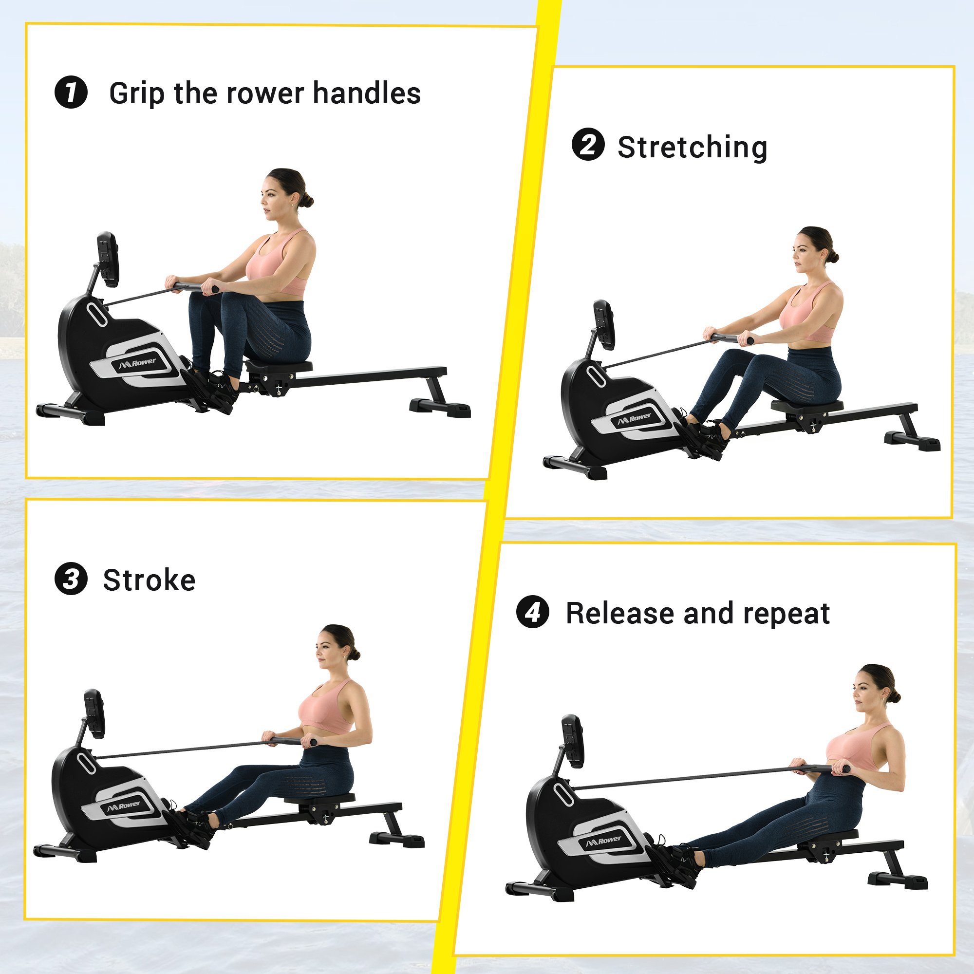 [Robust and Reliable] Made from heavy-duty steel, the rower frame is engineered to provide increased reliability to keep every user stable and secure when they want to do some cardio workout at home.[Multiple Adjustable] The excellent magnetic control system gives this rower 14 different levels of adjustable resistance. It can fully take care of your subtle requirements for exercise intensity, allowing you to better gradually improve your aerobic exercise level.[Best Exercise Feeling] This rowing machine is equipped with a comfortable ergonomic cushion and handle, which greatly enhances the user's exercise experience. The wide pedals are designed in an adjustable form to better meet the individual needs of different users.[Instant Workout Data] The LCD screen is connected to the motion sensor, which can display your current motion data in real-time. We also attached a small tablet holder on it, so you can watch entertainment programs or follow the video sports coach to keep your rhythm while sweating.[Easy to Maintain]Features a foldable design and transport wheels to allow users to store and move it from one place to another without difficulties. Rowing machine measures 78"x 21.2"x 32.3" (L x W x L) in use; folded size 63.8"x 21.2"x 32.3"(L x W x L) ; slide rail: 31.5", for up to 45.2'' Max Slide Inseam; Weight capacity: up to 330 LBSDescription:Best for Home Gym - This magnetic resistance rowing machine is undoubtedly the best choice for your home fitness. It meets your aerobic exercise needs while avoiding too much load on your joints or muscles. When you choose this magnetic rowing machine, you will find that its extremely quiet working performance allows you to exercise at any time without worrying about disturbing other family members.t choice for your home fitness. It meets your aerobic exercise needs while avoiding too much load on your joints or muscles. The 14-level adjustable resistance knob, ergonomically shaped cushions and handles, and adju