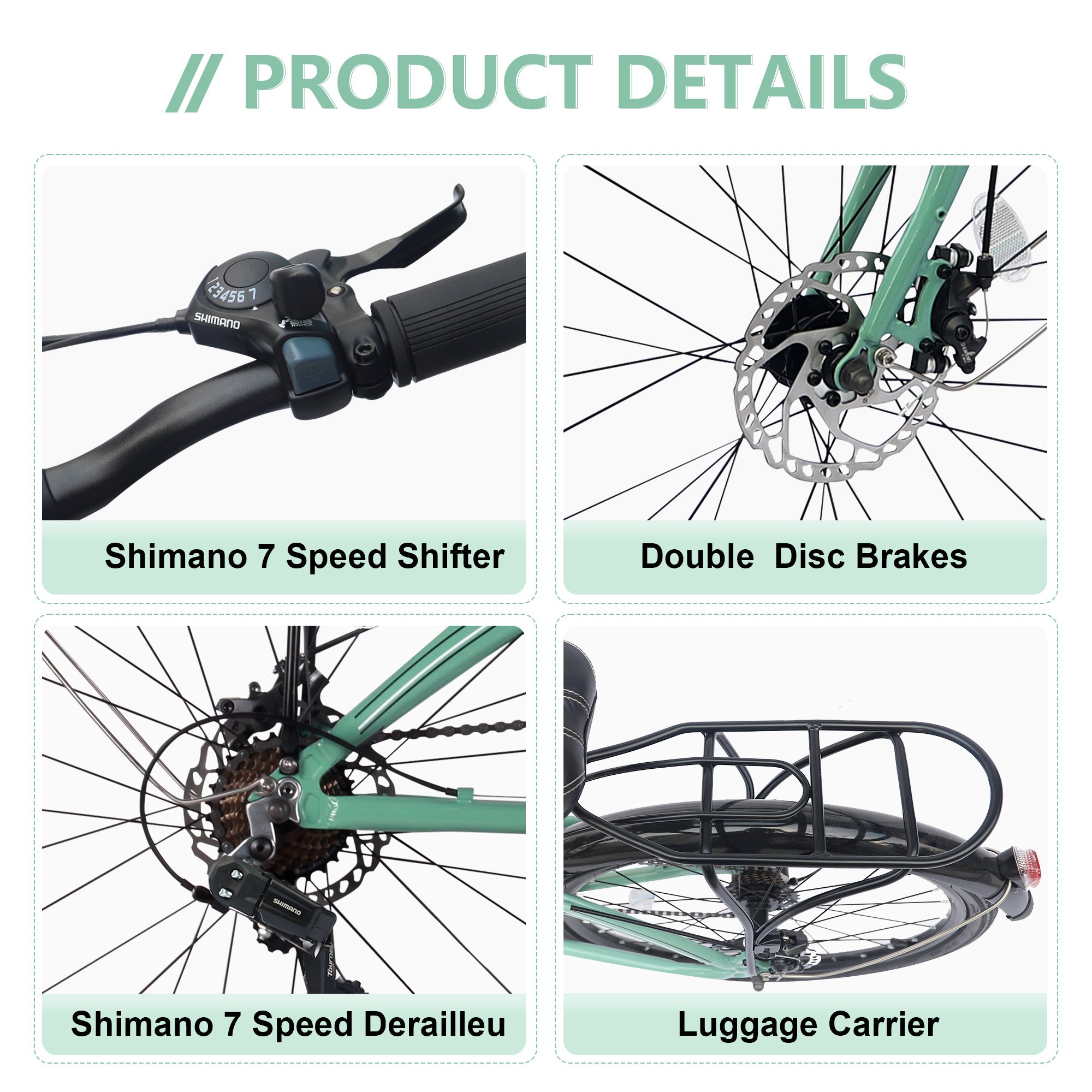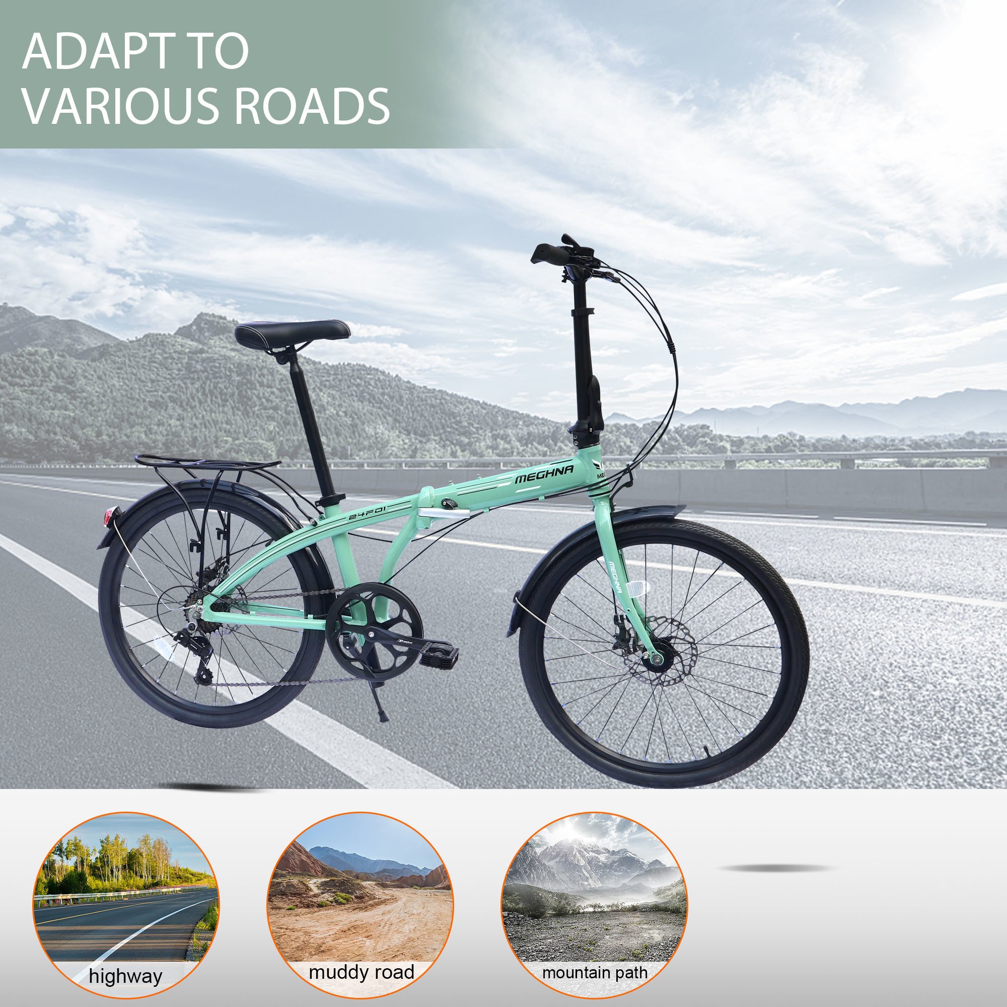 Bike Type24 inch Folding BikeAge Range (Description)AdultNumber of SpeedShimano 7 SpeedColorGreenWheel Size24 InchFrame MaterialAluminum Alloy FrameSuspension TypeNOSpecial FeatureLightweight