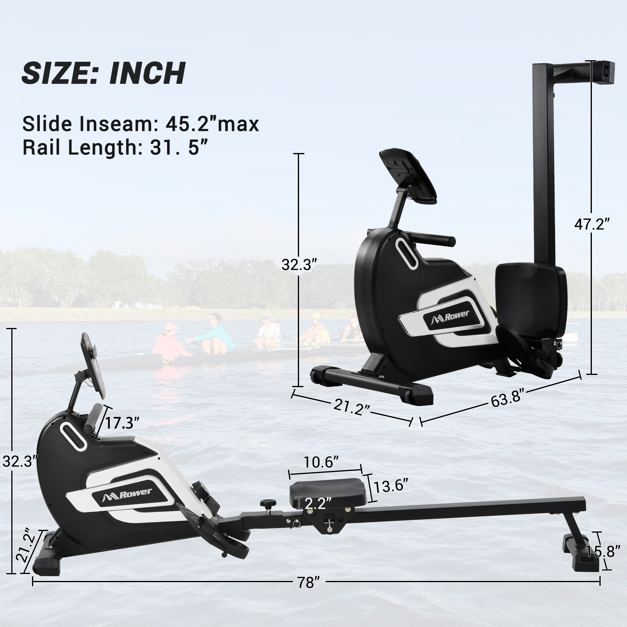 difficulties. Rowing machine measures 78"x 21.2"x 32.3" (L x W x L) in use; folded size 63.8"x 21.2"x 32.3"(L x W x L) ; slide rail: 31.5"; for up to 45.2'' Max Slide Inseam; Weight capacity: up to 330 LBS